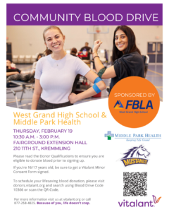 Middle Park Health and West Grand High School FBLA are sponsoring a Community Blood Drive with Vitalant.