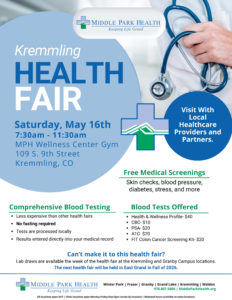 The Kremmling Health Fair will be held on Saturday, May 16th from 7:30am to 11:30am at the MPH Wellness Center Gym.